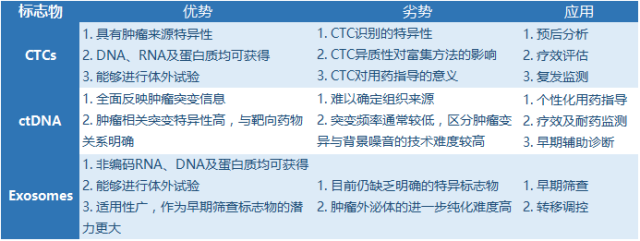 CTC,ctDNA 和外泌体虽然都是液态活检的检测对象,但各有特色。从本质上来说,CTC,ctDNA 和外泌体,这三者的特征和用途有较明显差异,可以相互补充。下面是三种方法优劣势及应用的比较: