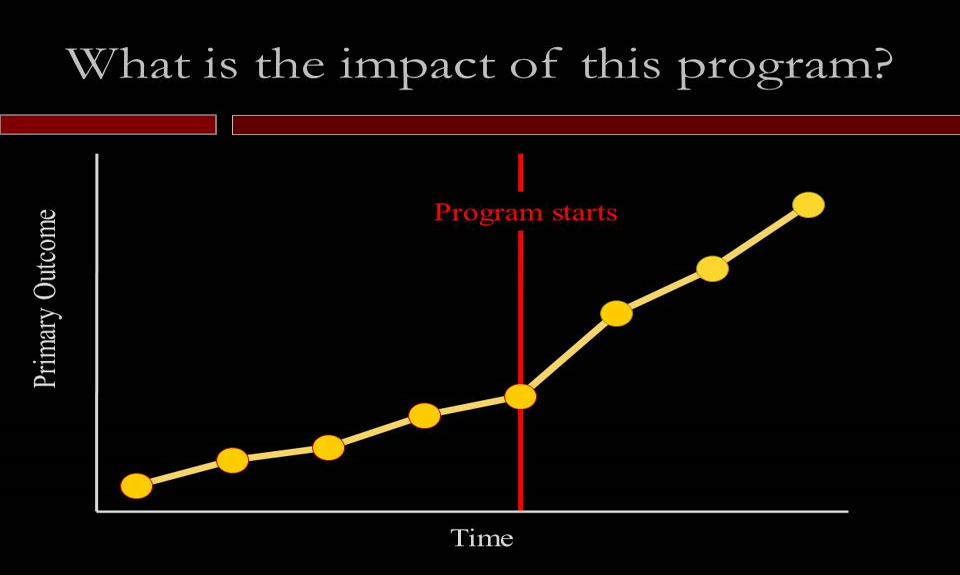 Impact is defined as a comparison between 1) the outcome after the intervention has been introduced, and 2) the outcome at that same point in time had the program not been introduced.