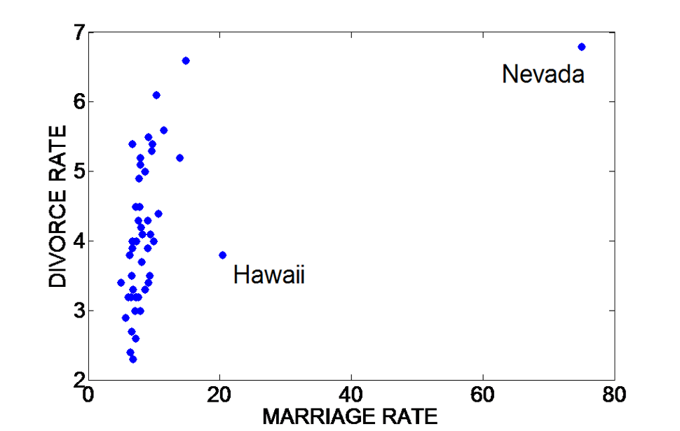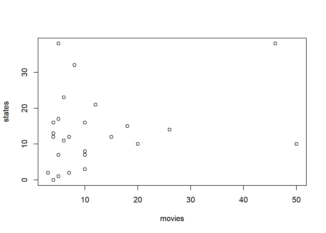 The “95 percent confidence interval” is a margin of error around the correlation coefficient. A wider margin, like this one, marks the extent of our ignorance/uncertainty about this relationship. Why are we still ignorant about the relationship between numbers of movies watched and states visited? Because we really don’t have a lot of data–25 pairs is a paltry size.