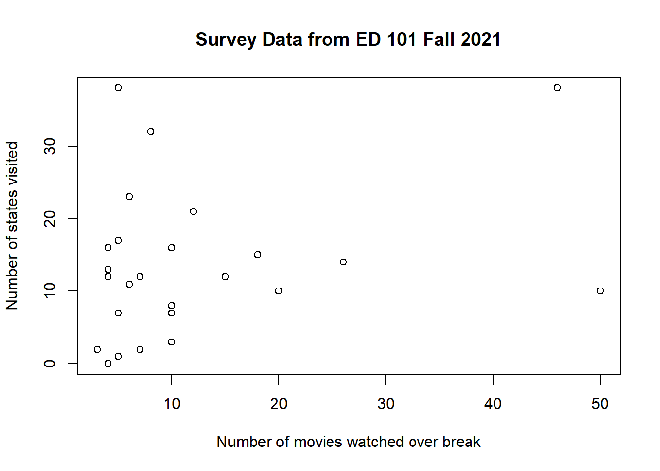 plot(movies, states, xlab="Number of movies watched over break", ylab="Number of states visited", main="Survey Data from ED 101 Fall 2021")