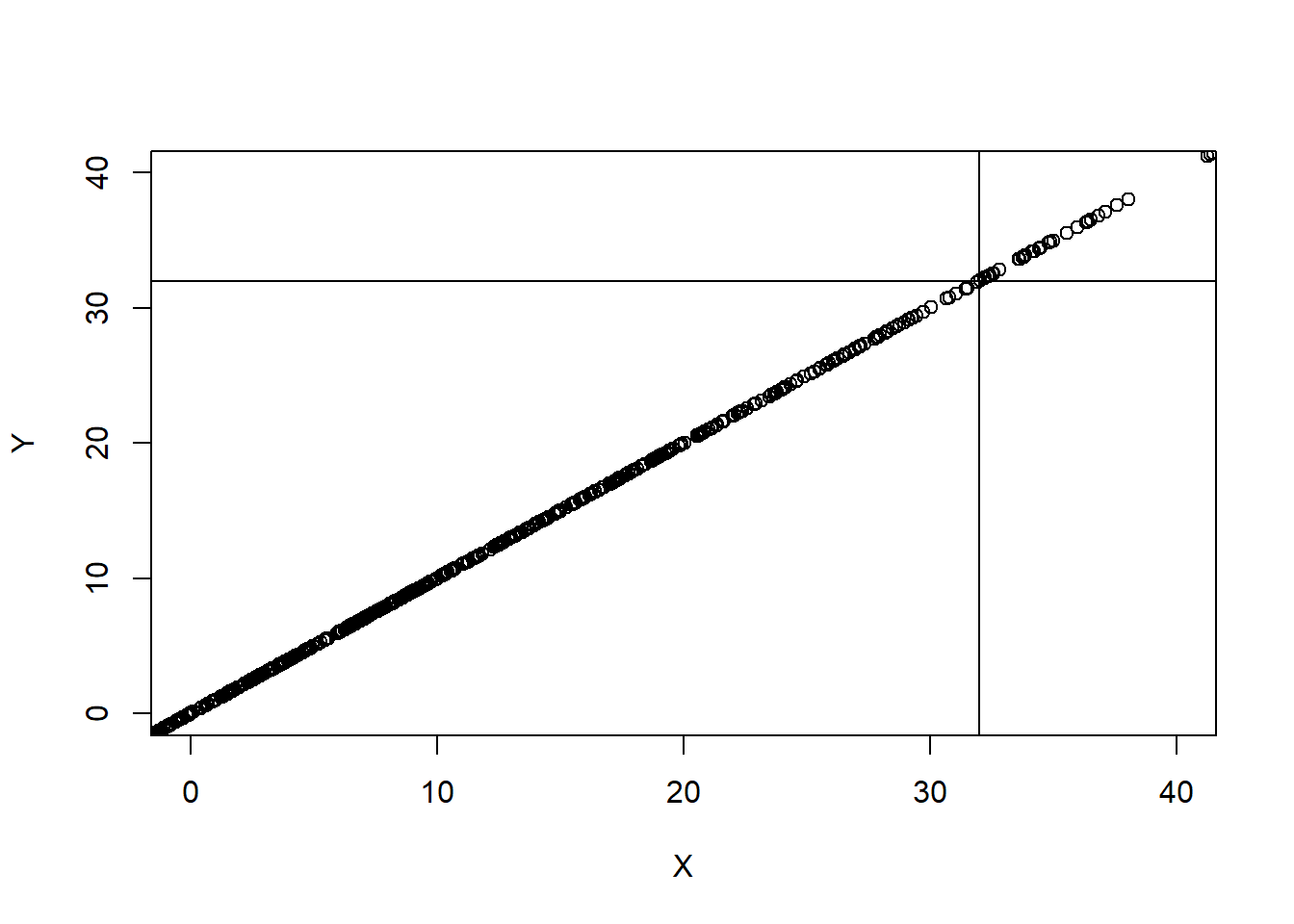 In the following correlation, which is perfect, a score of 32 on X is indeed accompanied by a score of 32 on Y.