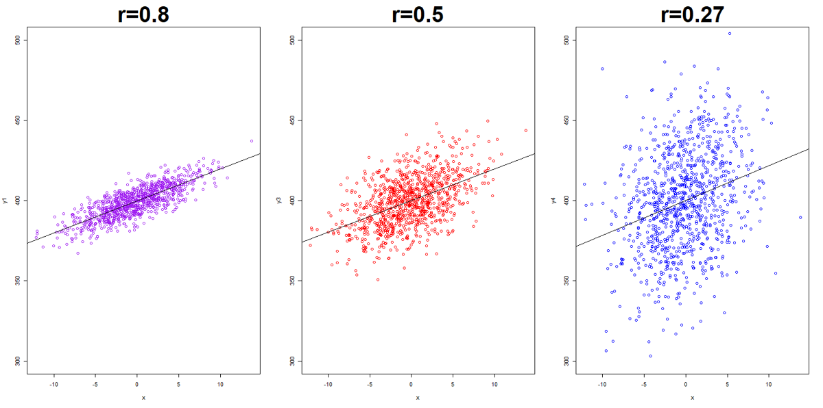 The following 3 scatterplots have identical upward slopes, and only differ in their tightness: