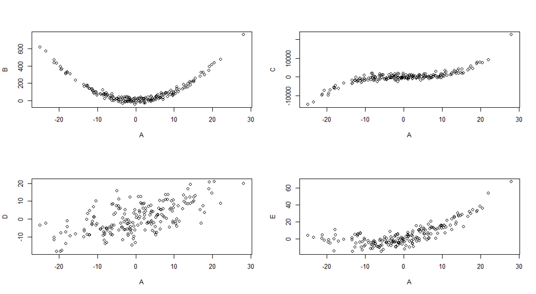 The upper left plot shows a slightly weaker correlation–as X goes up, Y very likely to go down, although there is a bit of uncertainty about it.