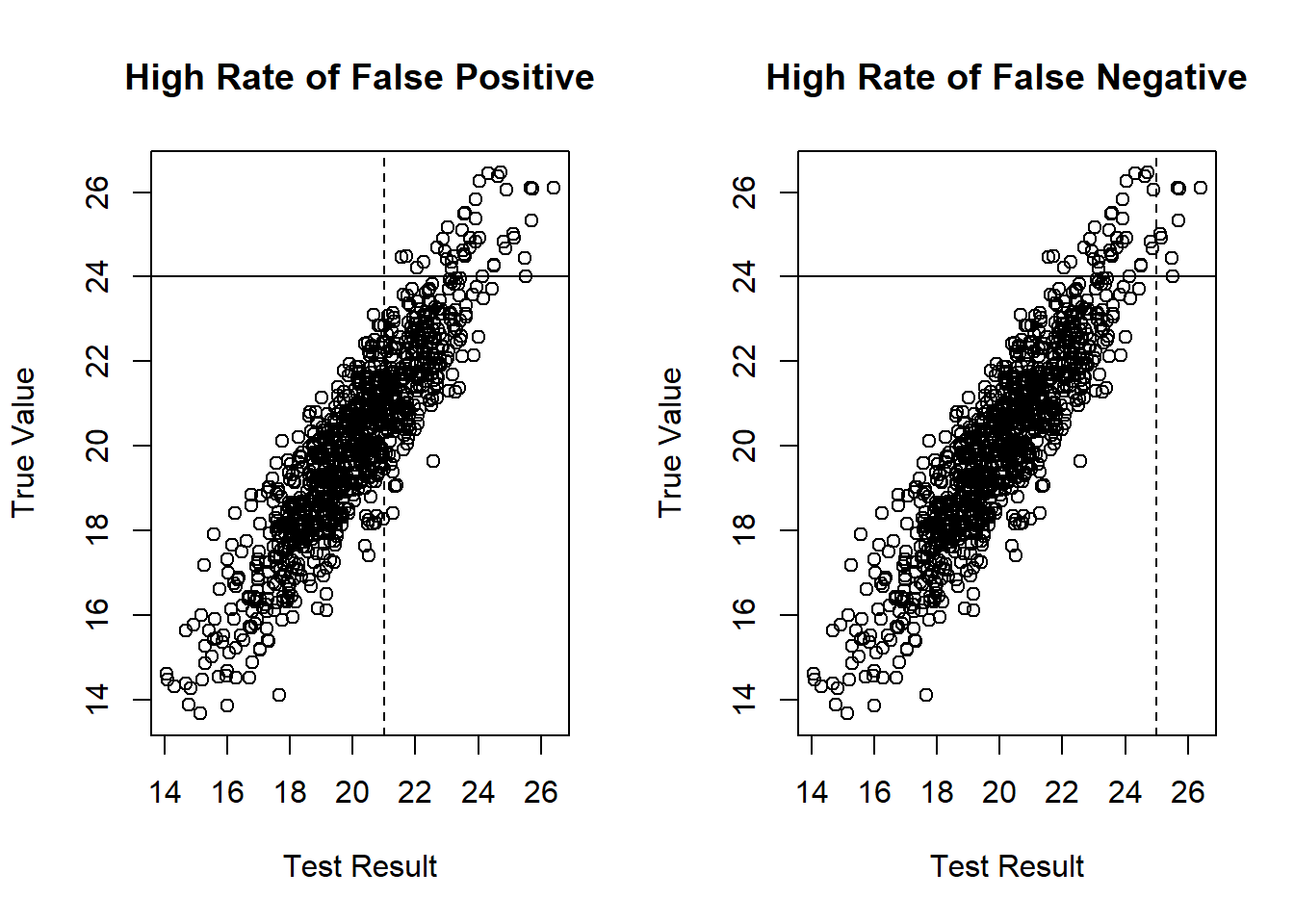 The vertical dashed line is the cutoff for the test results. The horizontal solid line is the actual threshold of the true value of the underlying trait. The dots ending up in the lower right quadrant are the false positives, and those in the upper left are the false negatives.