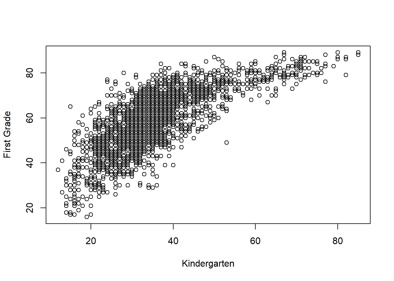 plot(c2rrscal,c4rrscal,xlab="Kindergarten",ylab="First Grade")