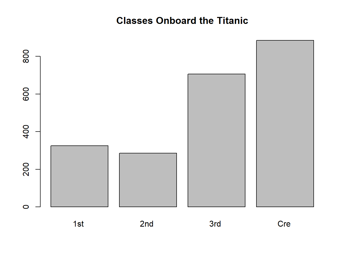 Here’s how to create a simple bar plot for the variable ‘Survied’ in the titanic data. Note that we are not directly creating a bar plot from the variable. The bar plot has to be derived from a table which we called ‘t.’