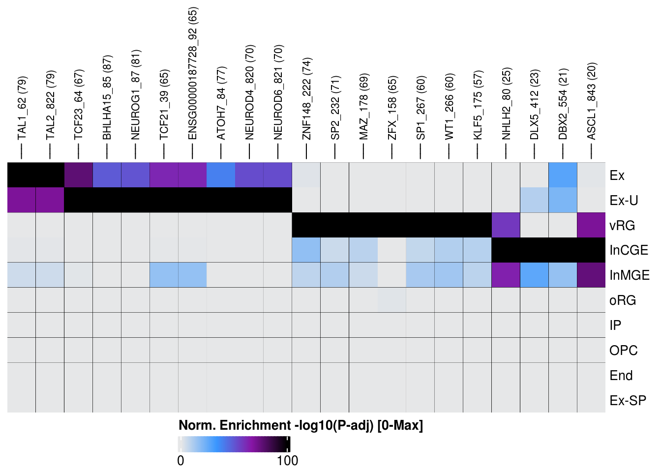 plotEnrichHeatmap(enrichMotifs, n = 7, transpose = TRUE)## ArchR logging to : ArchRLogs/ArchR-plotEnrichHeatmap-260819bc8eef-Date-2021-11-12_Time-15-00-15.log