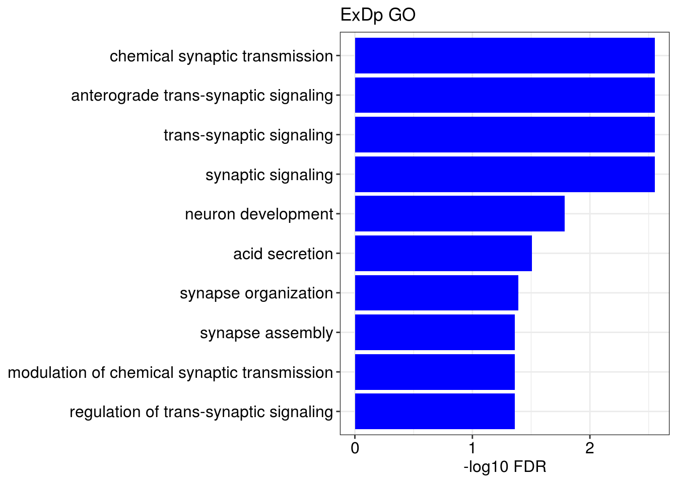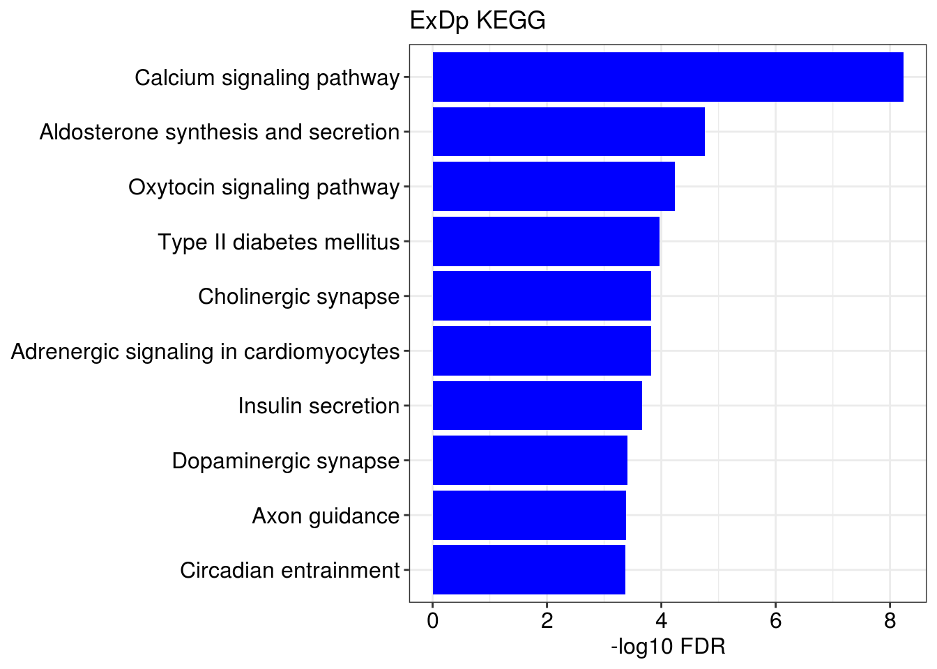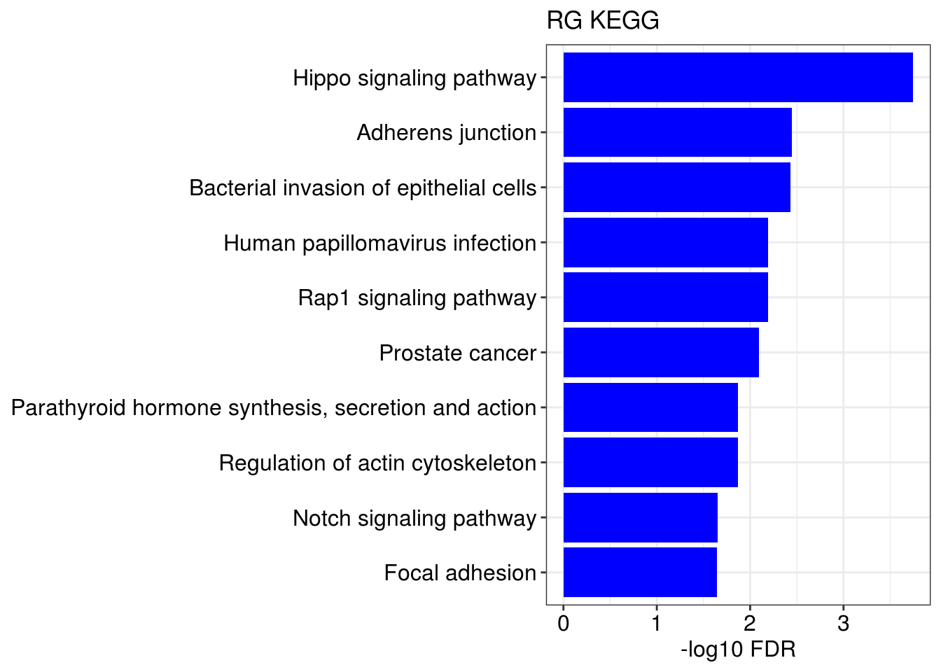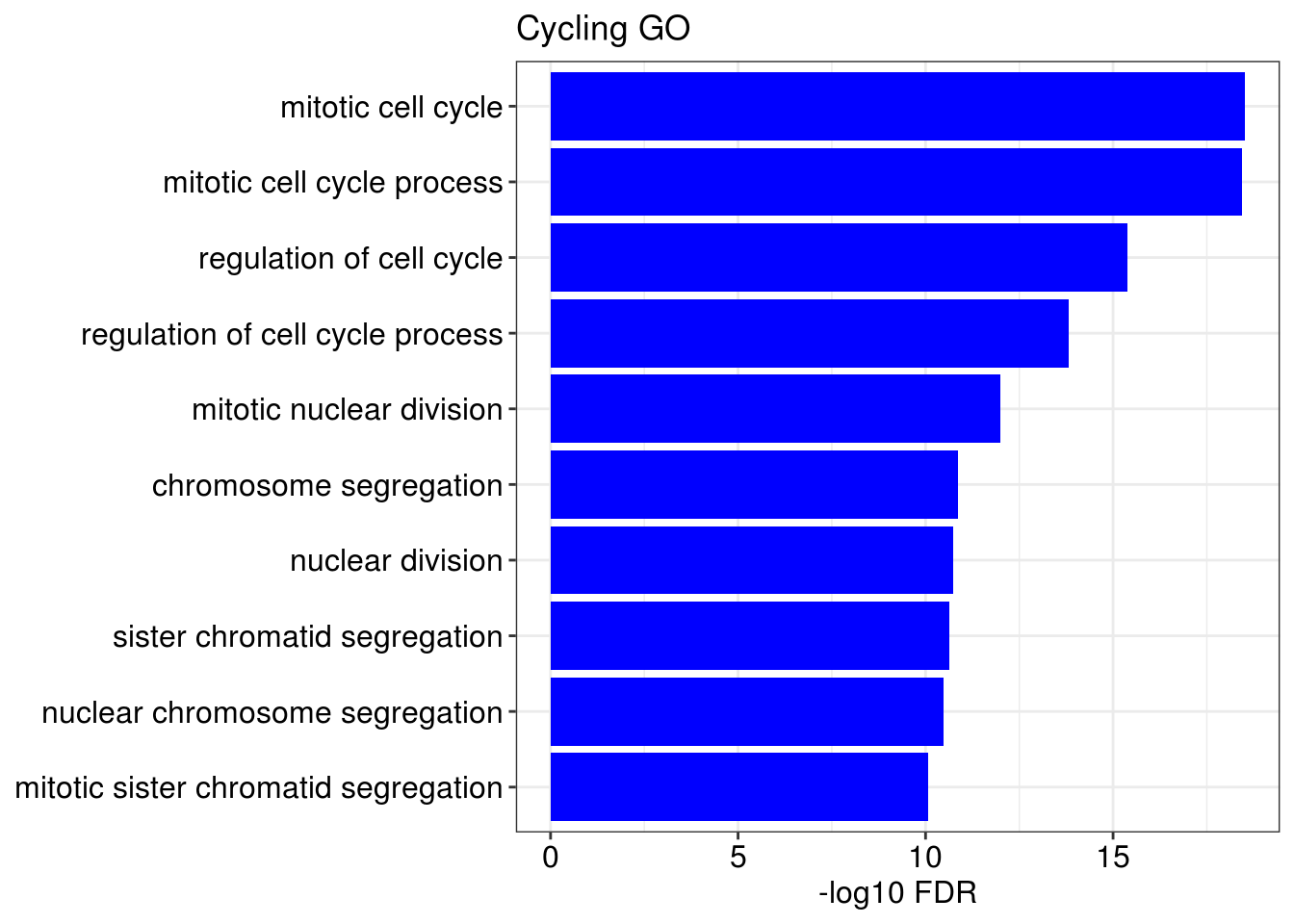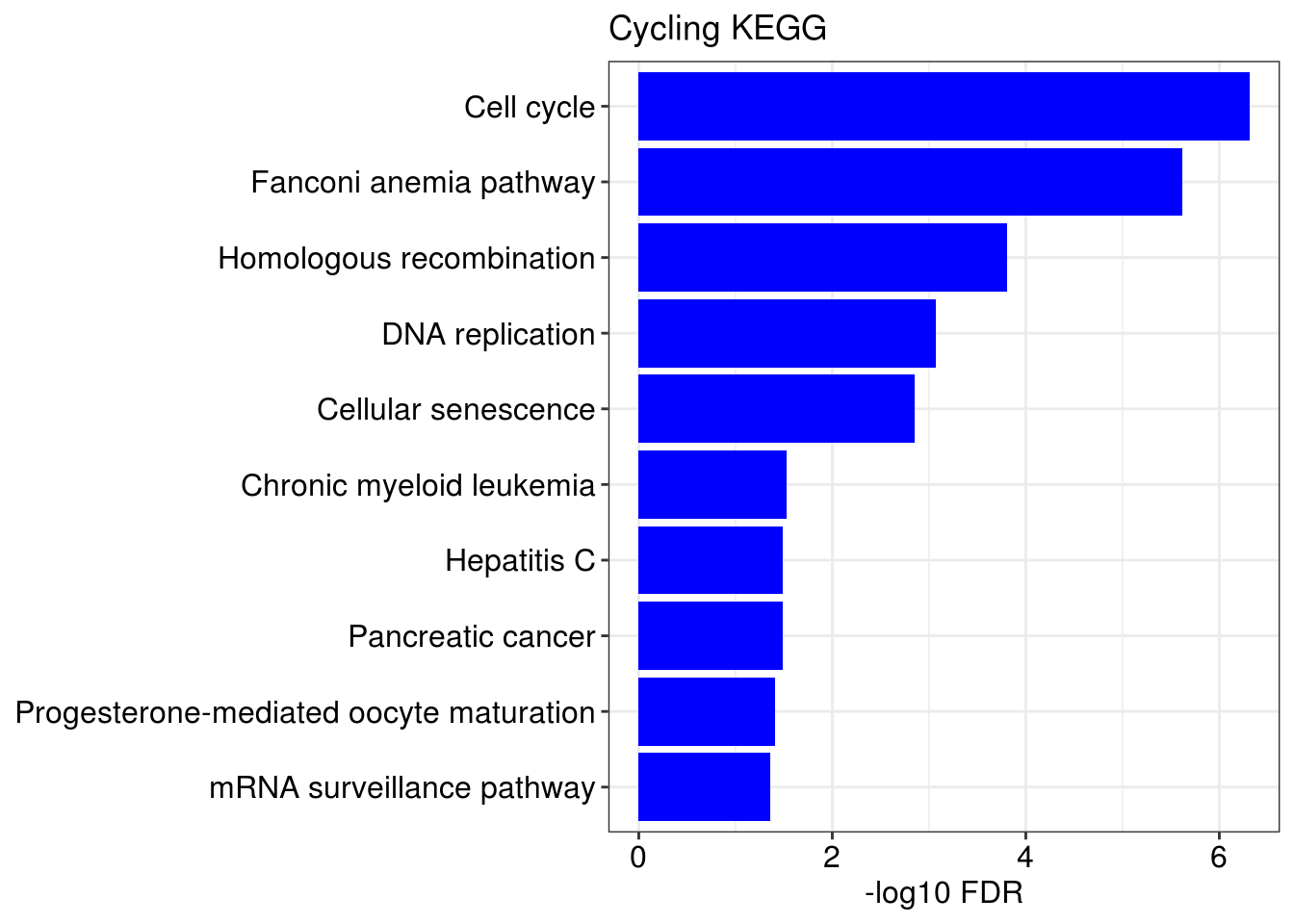 p + geom_col(fill = color) + ggtitle(title) + xlab('-log10 FDR') + ylab(NULL)