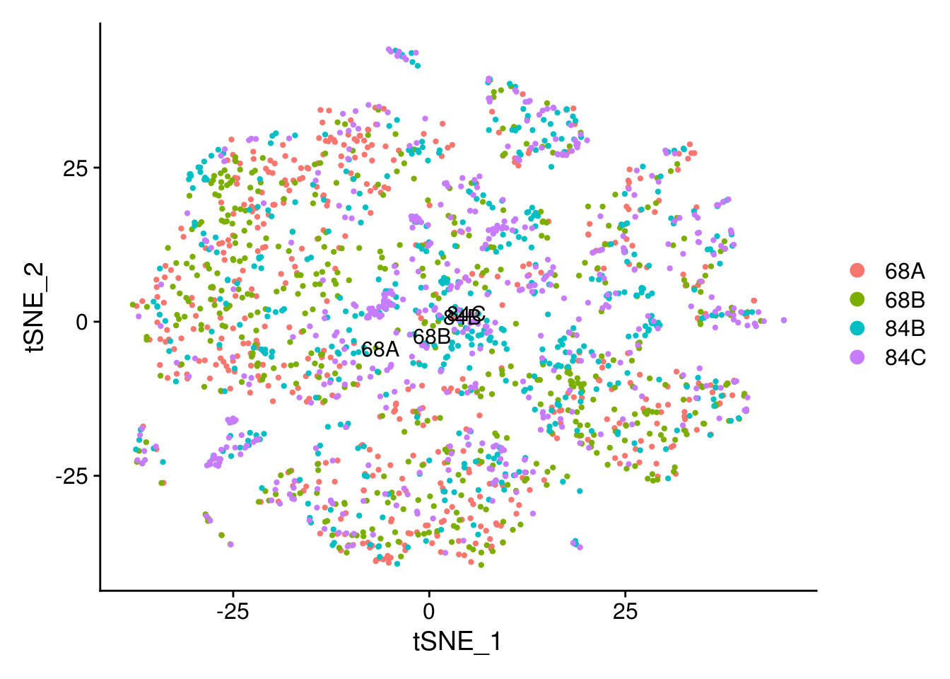 DimPlot(object = combined, reduction = "tsne", label = T)