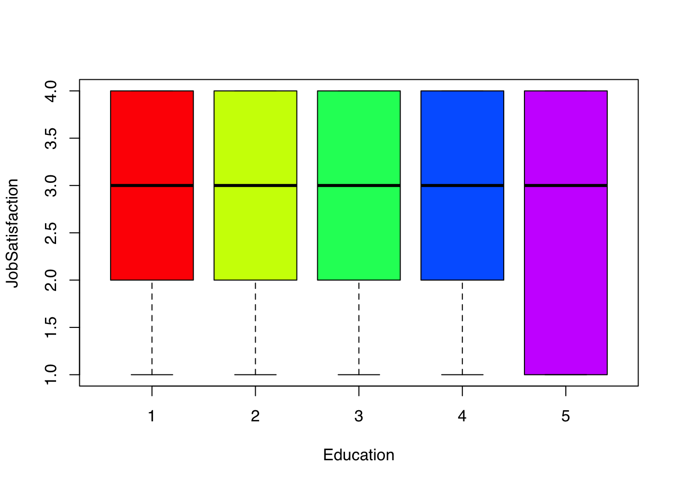 boxplot(JobSatisfaction ~ Education,IBM.HR.test, col=rainbow(5))