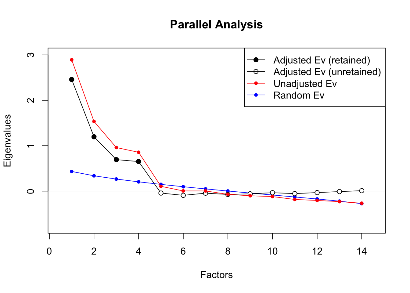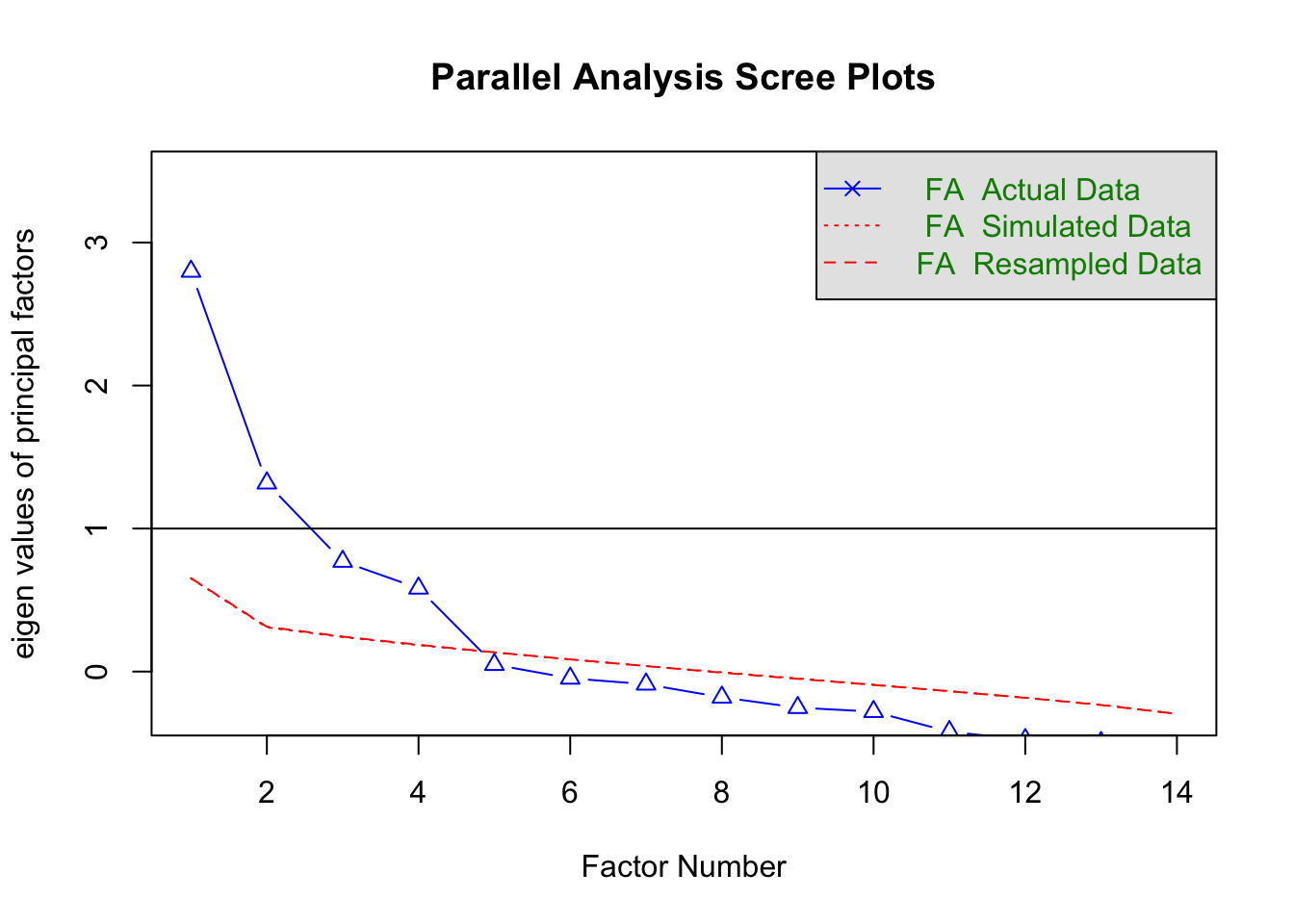 Kaiser’s rule, Scree test, *Parallel analysis 방법을 활용하겠습니다.