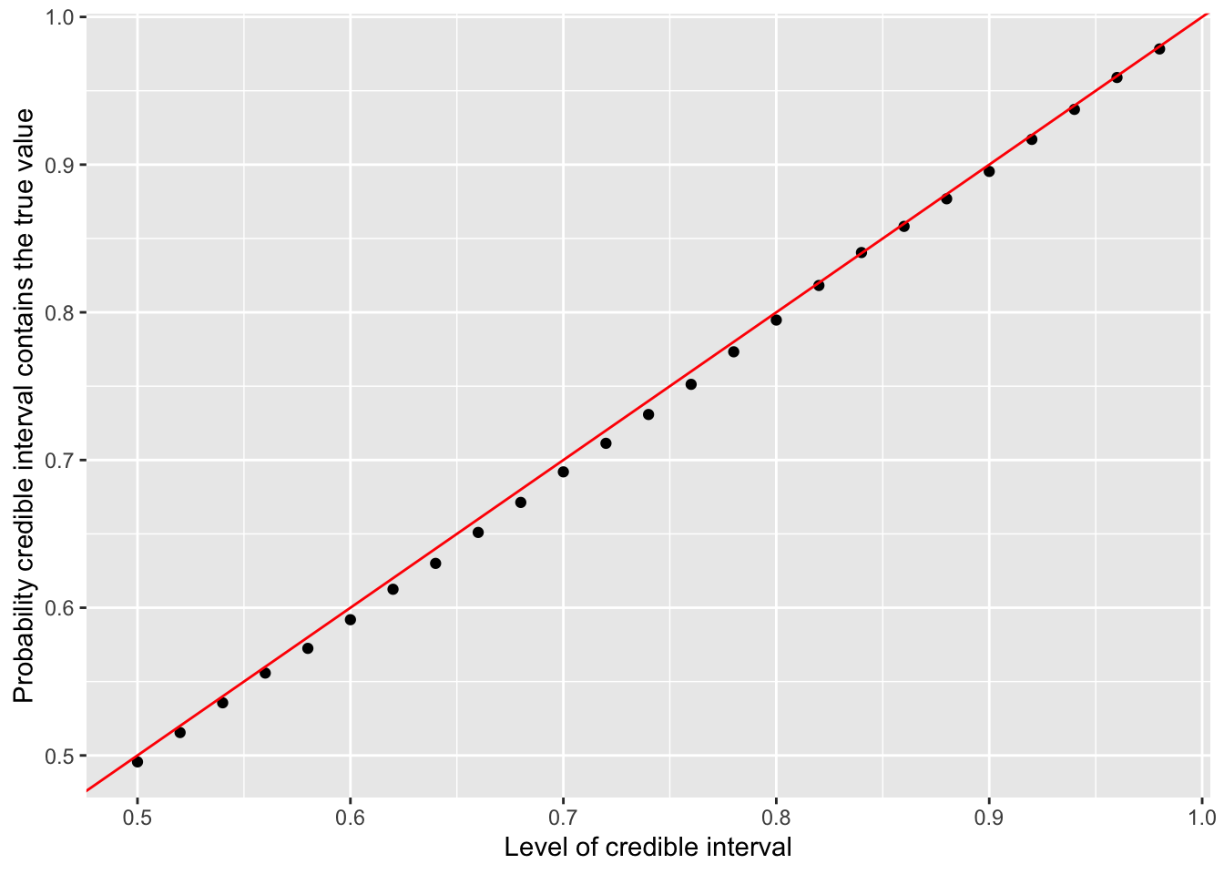 summarize(coverage = mean(.low <= p & p <= .high))## # A tibble: 1 × 1