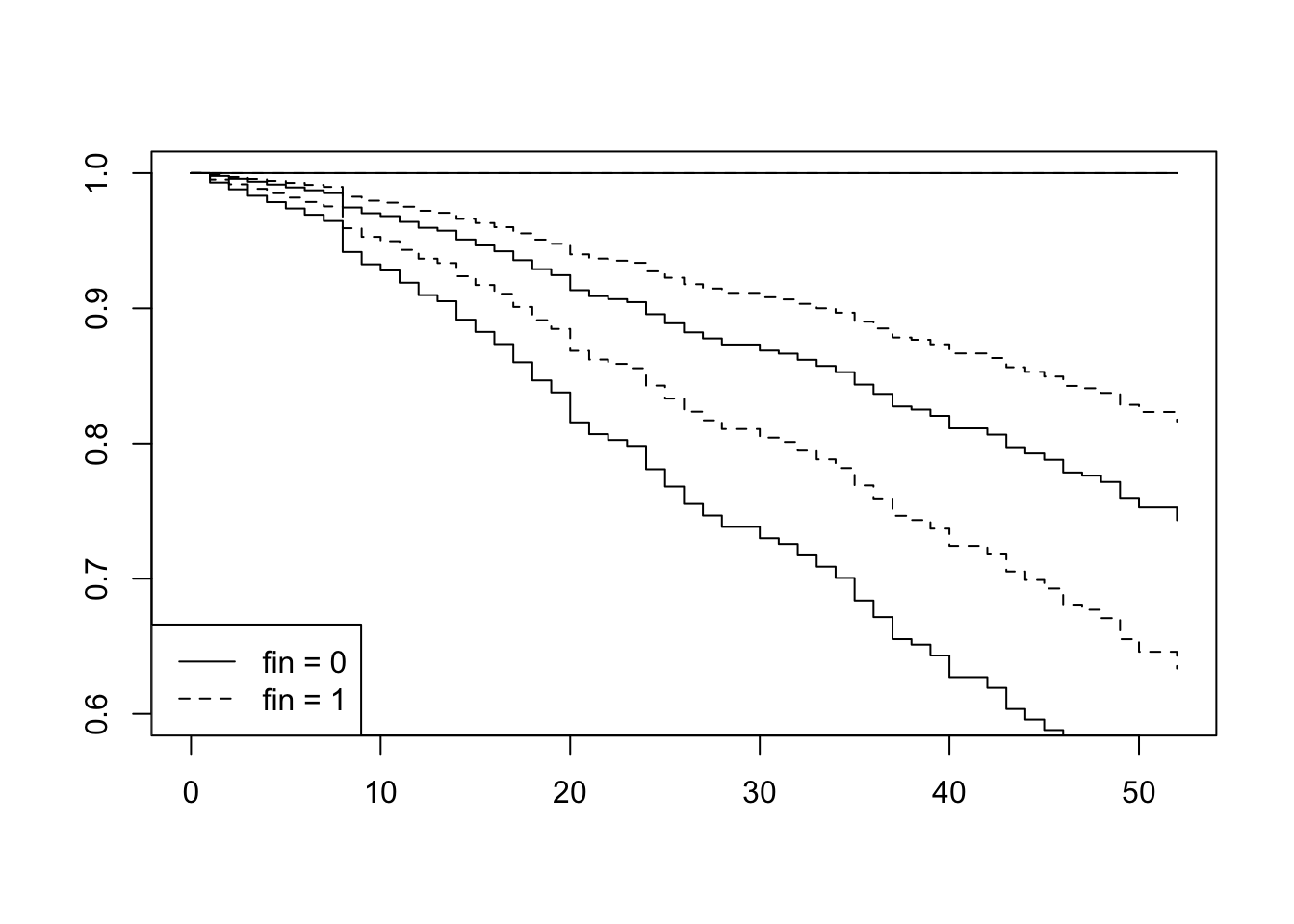 - the higher estimated ‘survival’ of those receiving financial aid, but the two confidence envelopes overlap substantially, even after 52 weeks