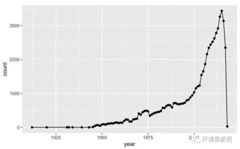 这个现象可能有点反直觉,因为近几年大气环境污染的公众关注度非常高,经费投放也很可观,但学术界却降低了学术交流频次。无独有偶,使用传统研究热点例如汞、铬、二恶英、基因组、纳米颗粒去进行检索,都会发现研究在2014-2015年间出现了峰值。但同时如果去看一些新兴研究例如3D打印,颗粒物中的细颗粒物(fine particulate matter),则增长还是非常迅速的(下图是以细颗粒物为关键词的文献发表状况)。