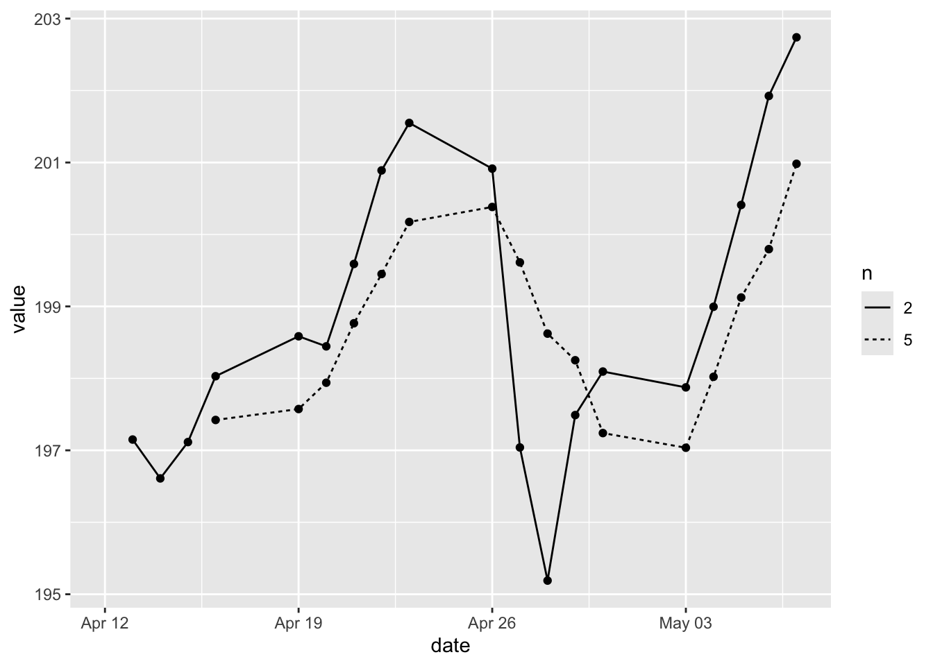Here we have two simple moving averages in MMM subset. We reshape it to the long format to create the grouping variable n. We use color to differentiate the groups with colour = n.