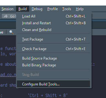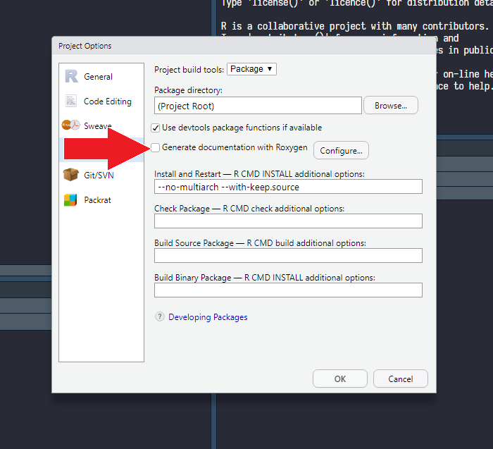 ドキュメントやNAMESPACEはRoxygen(後述(たぶん))を使って書きたいので、そのあたりがビルド時に自動で生成されるように設定を変更する。
