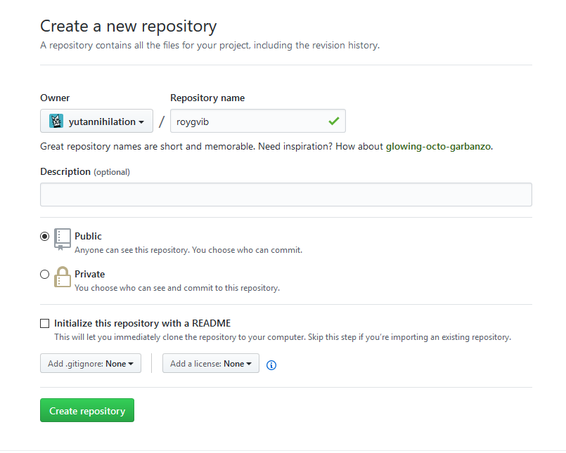 ついでに、GitHubにレポジトリを作ってremoteに設定しておこう。 まずは同名のレポジトリを作成する。 この際、Initialize this repository with a READMEやAdd a licenseは指定せず空のレポジトリにすること。 すでにファイルがコミットされた状態だと、今手元にあるものとコンフリクトが生じてしまう。