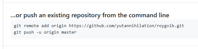 空のレポジトリをつくると、以下のようにremoteを加えるよう指示が出ているのでこれをそのままTerminalにコピペする(pushはまだしなくてもいい)。