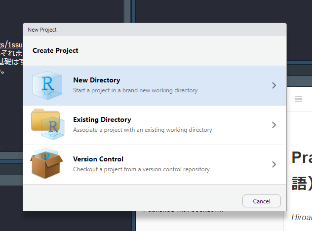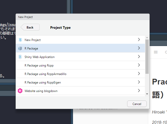 次に、New Directory、R Packageと選んでいく。