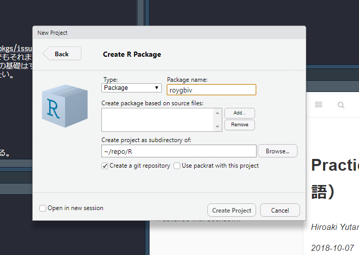 最後に、Rのパッケージ名を入力し、Create a git repositoryにチェックを入れたら、Create Projectをクリックする。
