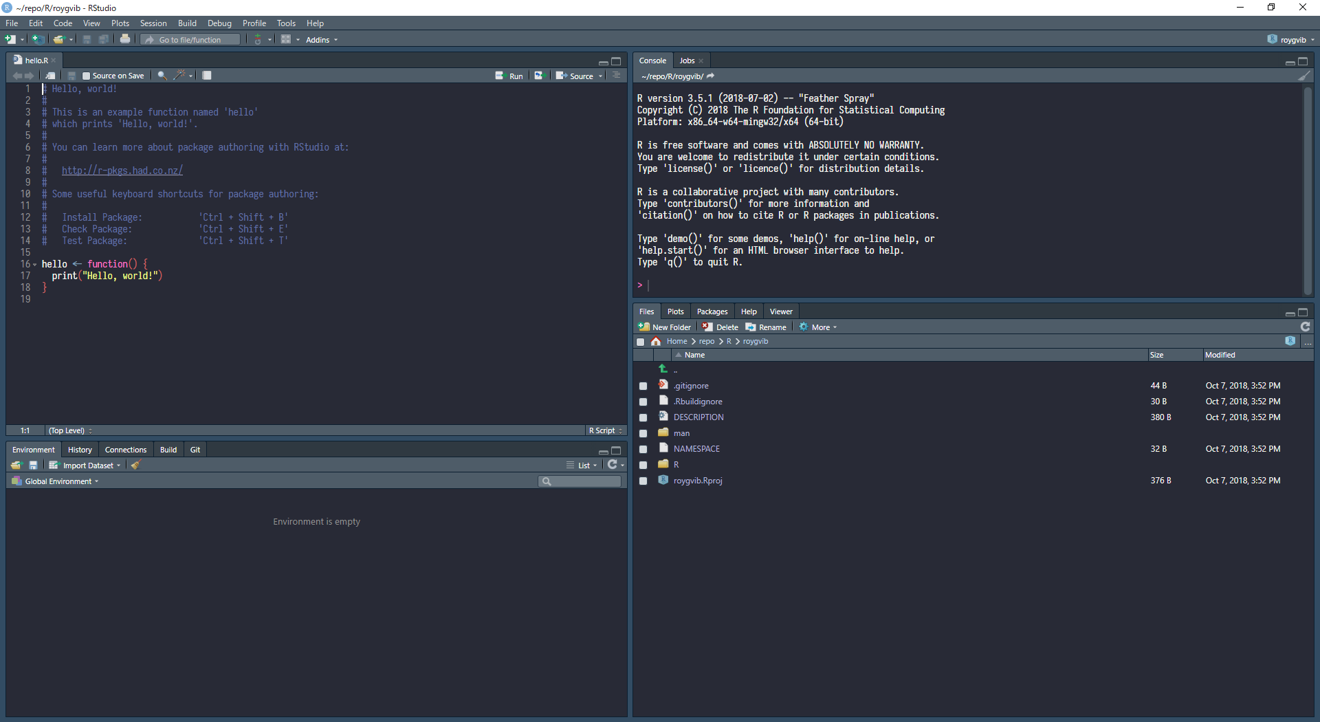 初期状態ではhello.Rみたいなファイルが見本として置かれているが、不要なので消す。具体的には以下の3つ。