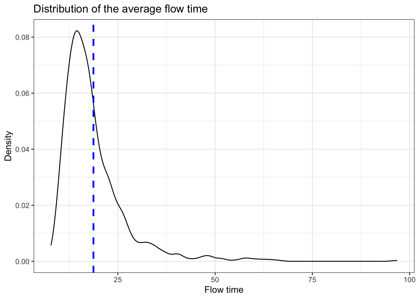 labs(title="Distribution of the average flow time",x="Flow time", y = "Density")