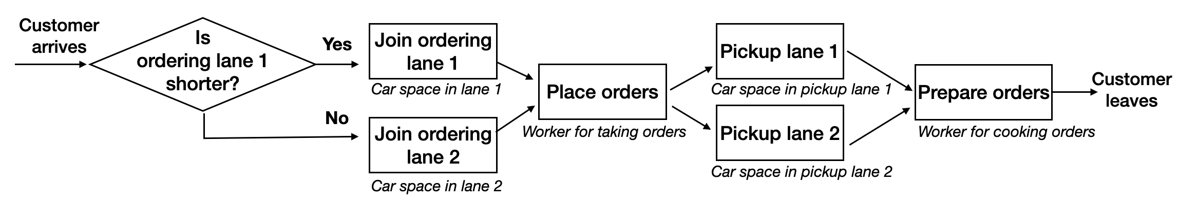 add_resource("lane1", capacity=space_ordering) %>% # Ample car spaces in ordering lane1