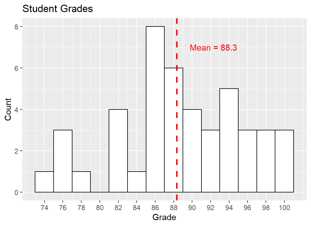 geom_text(aes(x = mean(dataset1[["grade"]]) + 4, y = 7, label = paste0("Mean = ", round(mean(dataset1[["grade"]]), digits = 1))), color = "red") +