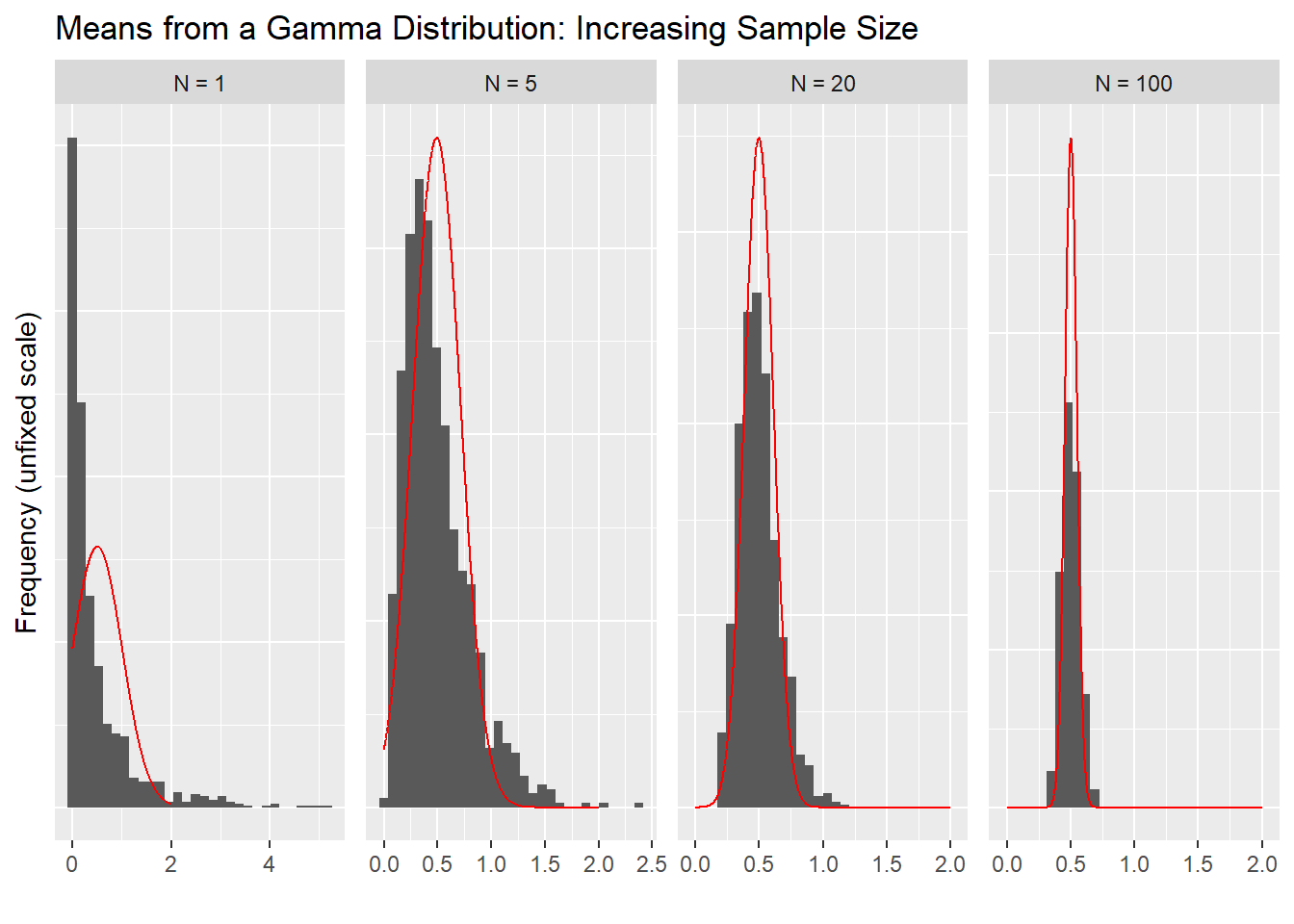 labs(title = "Means from a Gamma Distribution: Increasing Sample Size", x = "", y = "Frequency (unfixed scale)") +