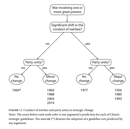 “whether China pursues a major change in military strategy depends on whether it encounters a strong external incentive for change and whether politics within the party enables senior military officers to respond to these changes by formulating a new military strategy if necessary. The external stimulus—the shift in the conduct of warfare—is a necessary condition for major change to occur. Party unity is a sufficient condition that allows the military to respond to the external stimulus.” (p.24)