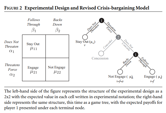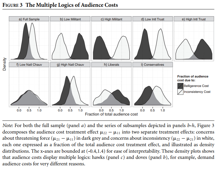 The main theoretical argument made in the paper can be illustrated by the their figure 2, where they point out existing experimental studies on audience costs apply a treatment with “double-barreled” effect.