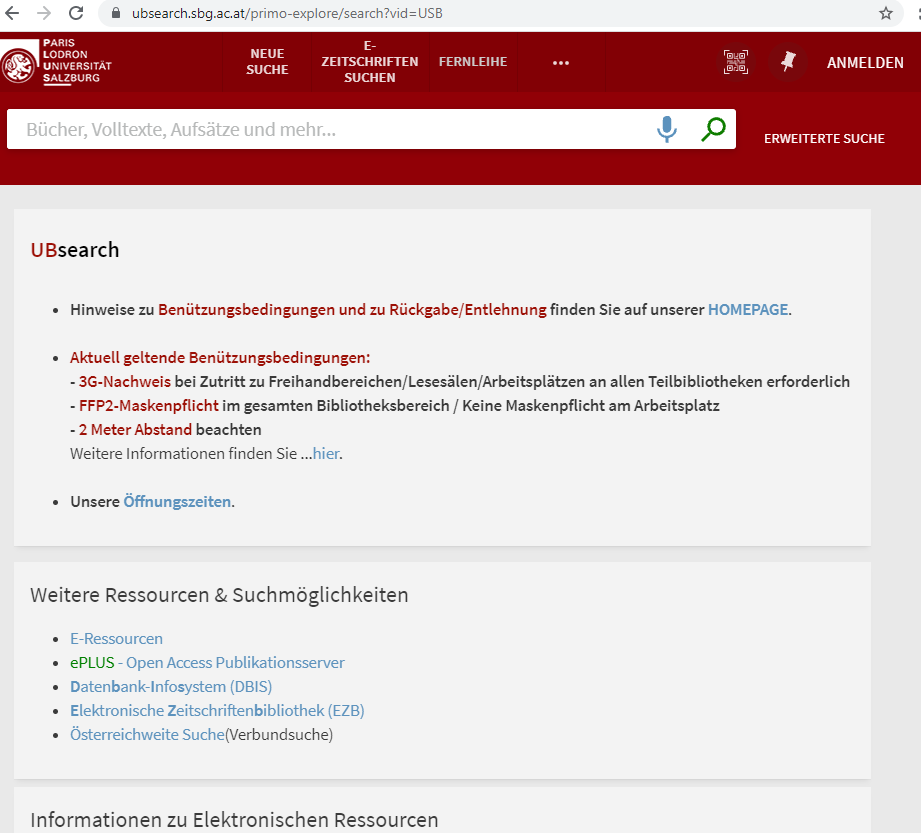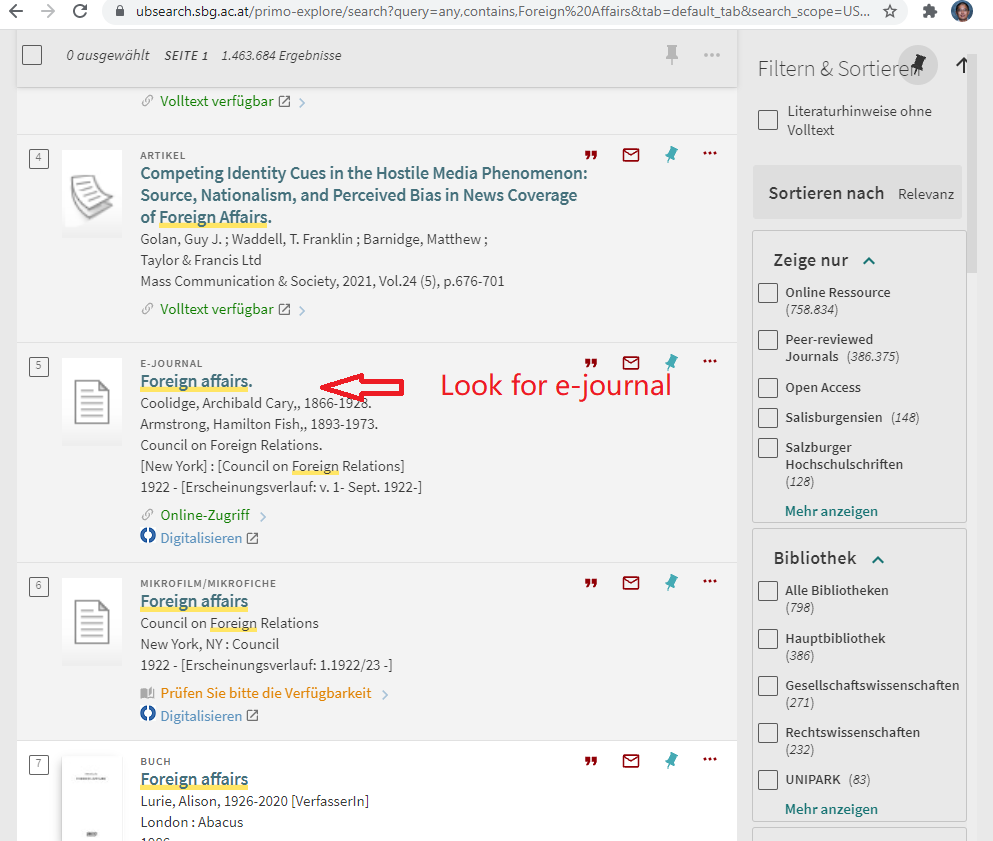 Here are the steps to search and download articles via the library’s portal. First, you need the library’s UBsearch: https://ubsearch.sbg.ac.at/. And then type in the journal you are looking for. In this example, it is Foreign Affairs.