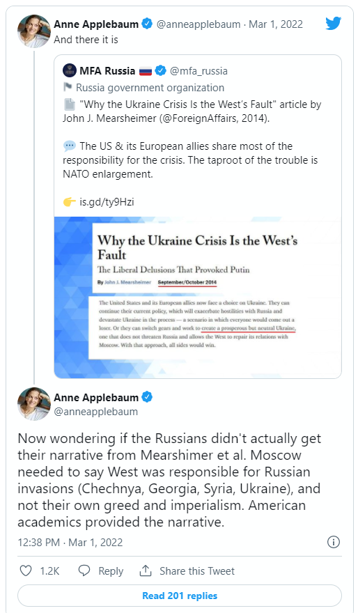 John Mearsheimer has become the center of a recent twitter storm as scholars and pundits debate about the reasons of and policies toward Russia’s invasion of Ukraine. It began with this tweet from Russia’s MFA and the retweet by Anne Applebaum.