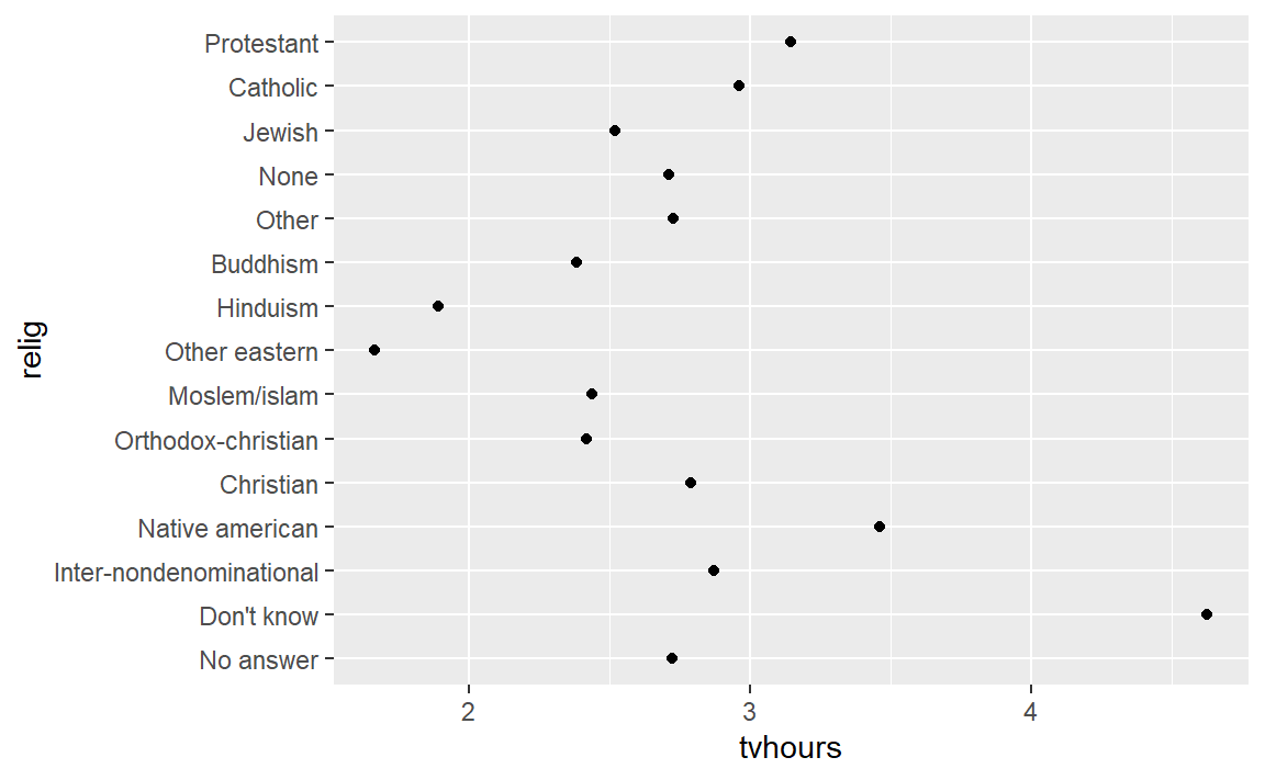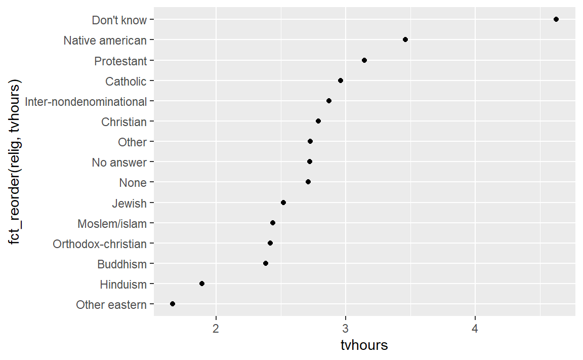 ggplot(relig_summary, aes(tvhours, fct_reorder(relig, tvhours))) +