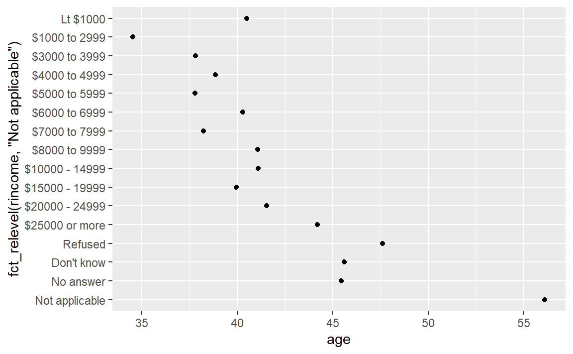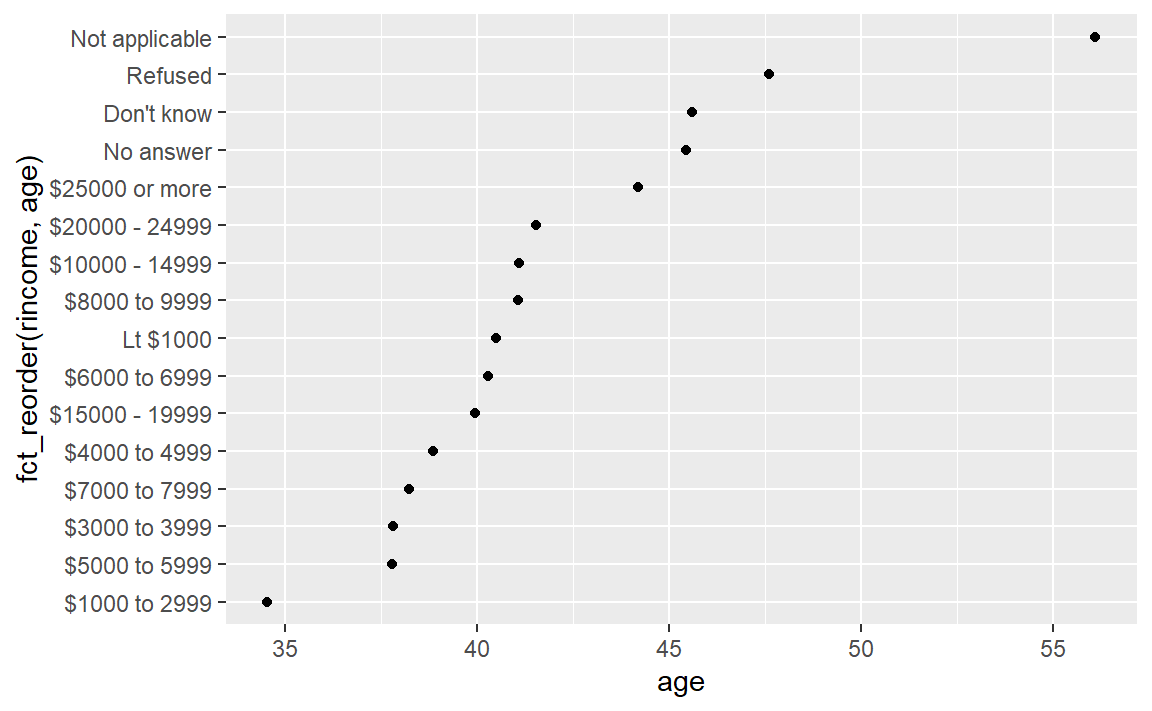 ggplot(rincome_summary, aes(age, fct_reorder(rincome, age))) + geom_point()
